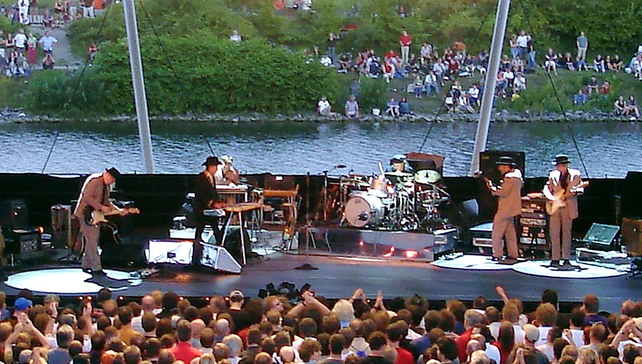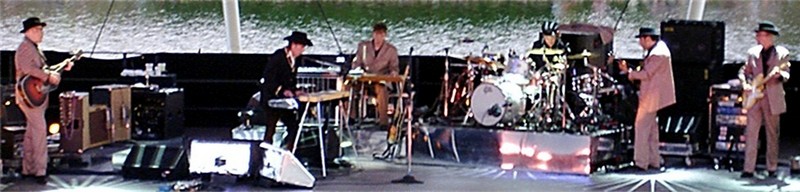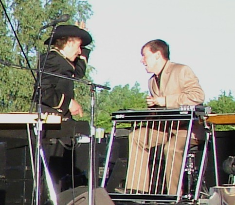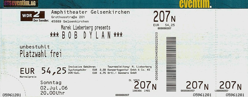 | JULY 02, 2006 AMPHITHEATER GELSENKIRCHEN GERMANY 1. Maggie's Farm 2. The Times They Are A-Changin' 3. Down Along The Cove 4. Señor (Tales Of Yankee Power) 5. Stuck Inside Of Mobile With The Memphis Blues Again 6. Desolation Row 7. I'll Be Your Baby Tonight 8. Honest With Me 9. Mr. Tambourine Man 10. Highway 61 Revisited 11. New Morning 12. Forever Young 13. Summer Days 14. Like A Rolling Stone 15. All Along The Watchtower Was the Bob Dylan concert in Gelsenkirchen worth "comin' down the road for a country mile or two"? In our case it was about 130 miles, coming down from Amsterdam, where my wife and I stayed for a night after flying in from Cork. We had a Gelsenkirchen show on TV already in Amsterdam, featuring a very good goal keeper from Portugal, and many sour faces from England. Driving into Gelsenkirchen last Sunday we saw way too many German flags on houses, cars, and bikes, but luckily that has changed by now too, thanks to some talented Italians. But this review is not about soccer, but about my 56th Bob Dylan concert, which took place in one of the finest venues I can recall, a modern amphitheater located directly at a canal (Rhein-Herne-Kanal), where boats, and kids and dogs run free. Underneath the sky of blue, we could see Bob Dylan and his band perform from our second row positions, with green trees located on the other side of the canal behind Bob’s head and hat, and the sky above those trees behind the heads of the band members. For the last two songs if the show I went halfway up the half circle of the seating area, to get a full view, with the canal behind the band, and the onlookers sitting behind the canal on the green grass on the shore. Not a bad way to start our yearly week in our native Germany visiting friends and relatives. Having seen both the shows in Kilkenny and Cork a week earlier, I was not expecting many rare or new songs for this year or tour, until I heard the band sound check, which included three songs I had never heard live before, but none of which made it into the show (Tough Mama, Queen Jane, and Waiting For You). The fourth song sound checked made it however into the set as song number six, ‘Desolation Row’, as gem which I had not seen since Dublin 2003. This Gelsenkirchen version (only the second one in 2006, after the mighty fine Jackson, Mississippi version, which I had heard on a recording) had this year’s brilliant organic treatment, featured Donnie on mandolin, and was sung very focused by Bob. It included six verses, plus four instrumental ones (instr. / postcards / Cinderella / moon / Ophelia / instr. / across / instr. / letter / instr.). I cherished every second of it. But this was only one of ten songs not seen by me in Cork a week earlier (and only one of those ten, H61, I had seen in Kilkenny), which leaves only the opener, ‘Maggie’s Farm’, ‘Memphis Blues’, and the three closing songs as every night occurrences for me. ‘Memphis Blues’ had some nice organ playing, and featured Bob on harp. Some of the other songs of the wonderful show included harp as well, for example song number two, ‘Times’, and song number nine, ‘Tambourine’, and also song number twelve, one of the biggest surprises of the night, the first 2006 appearance of ‘Forever Young’, a song which I had heard last in Dublin 2005, where it last was sung; but I also saw the previous German performance of this song in Düsseldorf 2003 . Both of them had been extra encores, but in Gelsenkirchen it preceded the closing trio of songs, which showed Bob and the band in great form, smiling and rocking along. But before that big finish there were some wonderful nuggets to behold in the main set, starting with song number three, ‘Down Along The Cove’, a jumbo jet of a song, which I had seen already in this form in Frankfurt, Düsseldorf, and Erfurt (and these are just the German performances I have seen). Hugely enjoyable stuff, as was song number seven, ‘Baby Tonight’. The most interesting songs of the night however were two more first of the year appearances, the first of which, ‘Señor’, was even more surprising being performed by Dylan as the fourth song, as it usually appears as song number two. It featured once more fine vocals and another strong harp solo by Bob, and was performed for the 10th time in my native Germany during the "never ending tour". Somehow my wife and I seem to be present more often than not when this nugget gets presented on German soil. We saw both German appearances of this gem in 1995 (Aschaffenburg in March and Dortmund in July), both in 1998 (Nürburgring and Essen), and both in 2005 (Wetzlar and Erfurt). Only the three German appearances in 2003 we did not see. But since we also saw performances in Brussels 1996, Manchester 2002, and Dublin 2005, I am happy to say that the fine Gelsenkirchen version was our 10th ‘Señor’. The other new for this year event was song number eleven, a wonderful “organic” ‘New Morning’, the slow long intro of which sounded quite different with Bob on organ than it did on the piano versions from last year. I had witnessed already one of the 17 European performances of it in 1991, but the appearance of "New Morning" I had seen in Wetzlar last fall was the first one in Europe since then. I had seen it once more in Dublin last November, but I did not mind at all hearing this one again in Gelsenkirchen, “underneath the sky of blue”. For songs like these and as long as Dylan keeps on creating performing art as fine and enjoyable as this Sunday show it is definitely worth "comin' down the road for a country mile or two", no matter if it is the road to Kilkenny, to Cork, or to Gelsenkirchen. After all, in the arena of live entertainment for me Dylans concerts alone can generally be described (to borrow his own words from his ‘Theme Time Radio Hour’) as “consequential, meaningful, weighty, basic, essential, and fundamental”. |  |